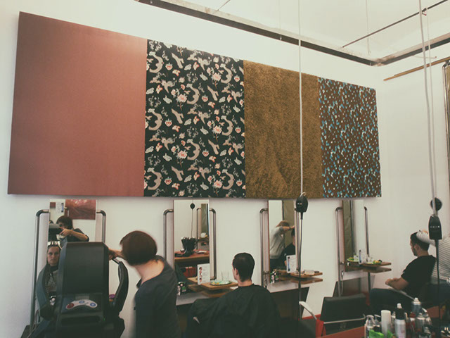Der Friseur im Servitenviertel nach über 15 Jahren im Wesentlichen unverändert. Feierlicher Leuchtstoff-Luster, Kinosessel, Heraklit und viel Gestepptes. Die Montage mit sechsköpfigem Team war ein Freudenfest.