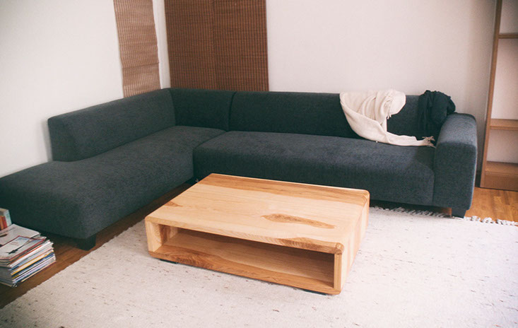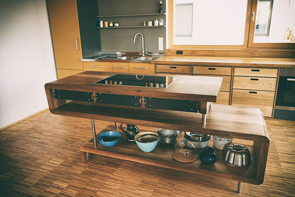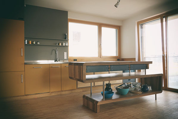 Mit Askese hat die Insel der erdig getönten Küche eher wenig gemein – 7cm massive Nuss! Man könnte auch darauf tanzen, wenn man wollte. Dass die Abstufung rechts zum Lieblingsplatz erklärt wird, war mir schon während dem Planungsprozess klar.