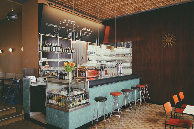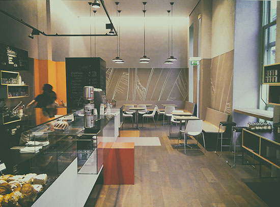 Manchmal, wie bei Dominiks Stand 16 am Schwendermarkt, braucht's nur wenig. Der derbe MFP-Boden war wichtig um die Härte und Kühle der Fliesen zu mildern. Eine Raumschleuse aus demselben Material, hier orange gebeizt und mit Kreidetafel. Der Rest wächst nach und nach hinzu … finito! Übrigens der beste Espresso der Stadt … und diesen gibts nun aber in einer rundum revitalisierten 50er Tschumsn. Ein stadtbekannter Lokalkritiker beschrieb es in seiner Rezension treffend als Espresso-Weltkulturerbe – na hööö! Ein Affe, Schwendergasse 19.