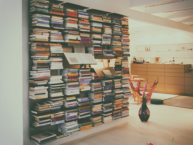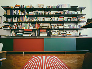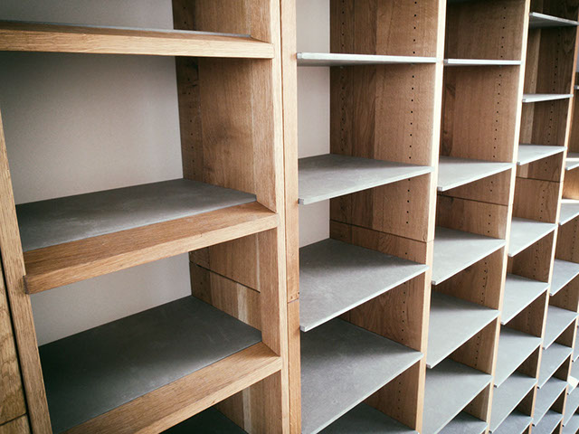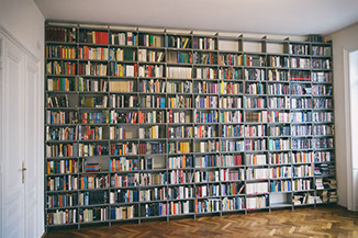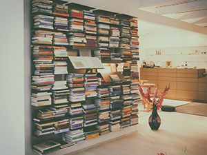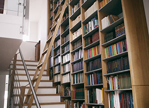 Die Bücherleidenschaft eines Historikers. 4000 Bände, 5,3 m hoch, 3,3 m breit, 0,4 m tief für eine hinten liegende, zweite Buchreihe. Eiche massiv, Eternit und eine treppentaugliche Bibliotheksleiter, die sich unbemerkt ins Regal verzieht. (Bild 4-6)