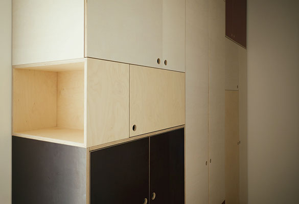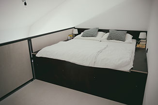 Nachts wandern die Eltern eine Ebene höher. Ursprünglich als Einschränkung befürchtet, fand der Raum durch den Einbau einer Zwischenebene deutlich mehr Gleichgewicht im Raumgefüge.