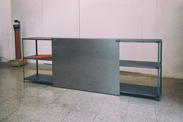 Lena Kvadrat, Artpoint in Berlin. Stahlprofile, verzinktes Blech, Sperrhölzer und von Lena herself importierte, echt russische Möbelgriffe. Leider gibts diese Filiale nicht mehr. Sehr schade.