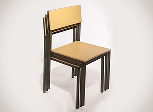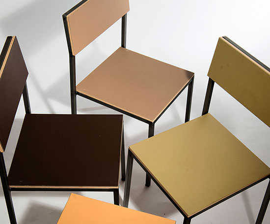 Kurzweil sollte sich das neue Lokal nennen. 484 Gestellteile für 44 Stühle zuschneiden war, zugegeben, eher langweilig. Fertig geschweisst waren sie in 2 Wochen, Sperrholz zugeschnitten, Linol in diesen wunderbaren warmen Erdfarben drauf und fertig. Hätten wir sie nicht stapelbar konzipiert, wär's in der Werkstatt ganz schön eng geworden.